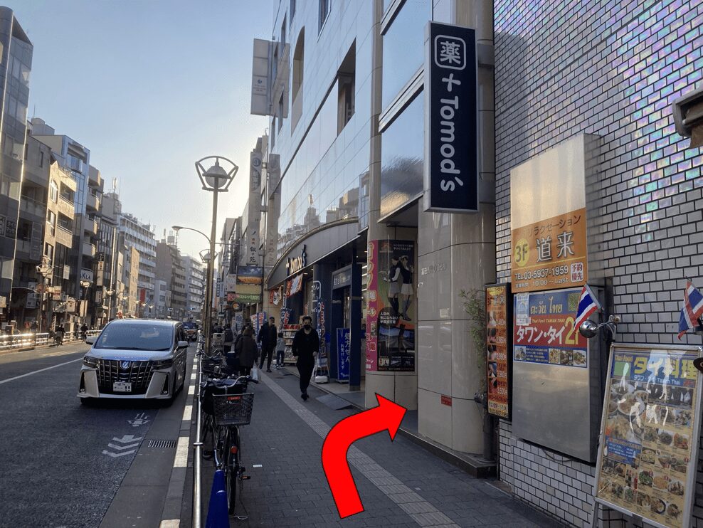 ⑦右手のTomod’s(トモズ)のビルに入りエレベーターで地下1階に下ります