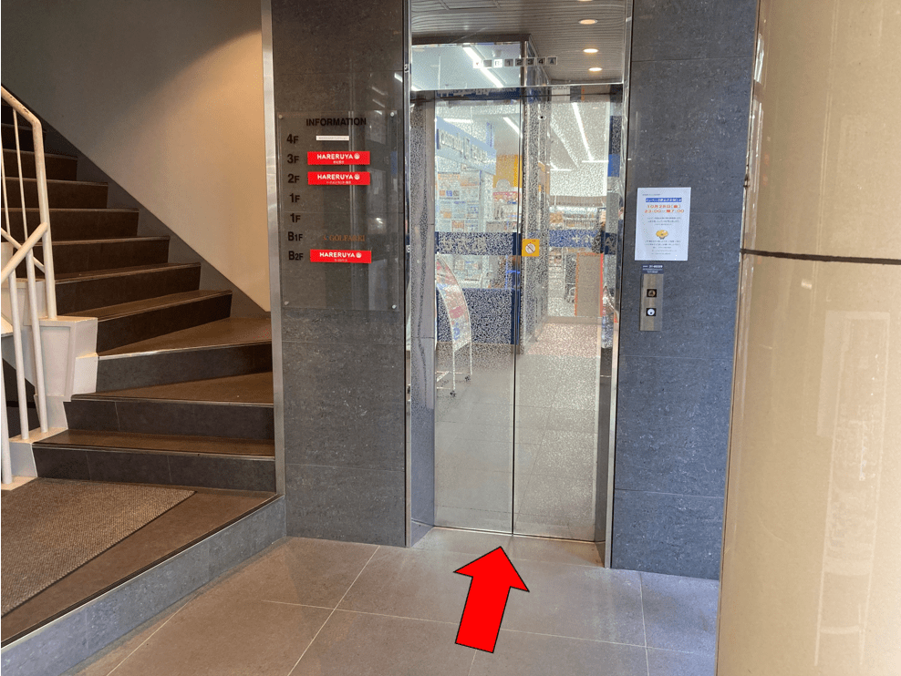 ④右手のTomod’s(トモズ)のビルに入りエレベーターで地下1階に下ります