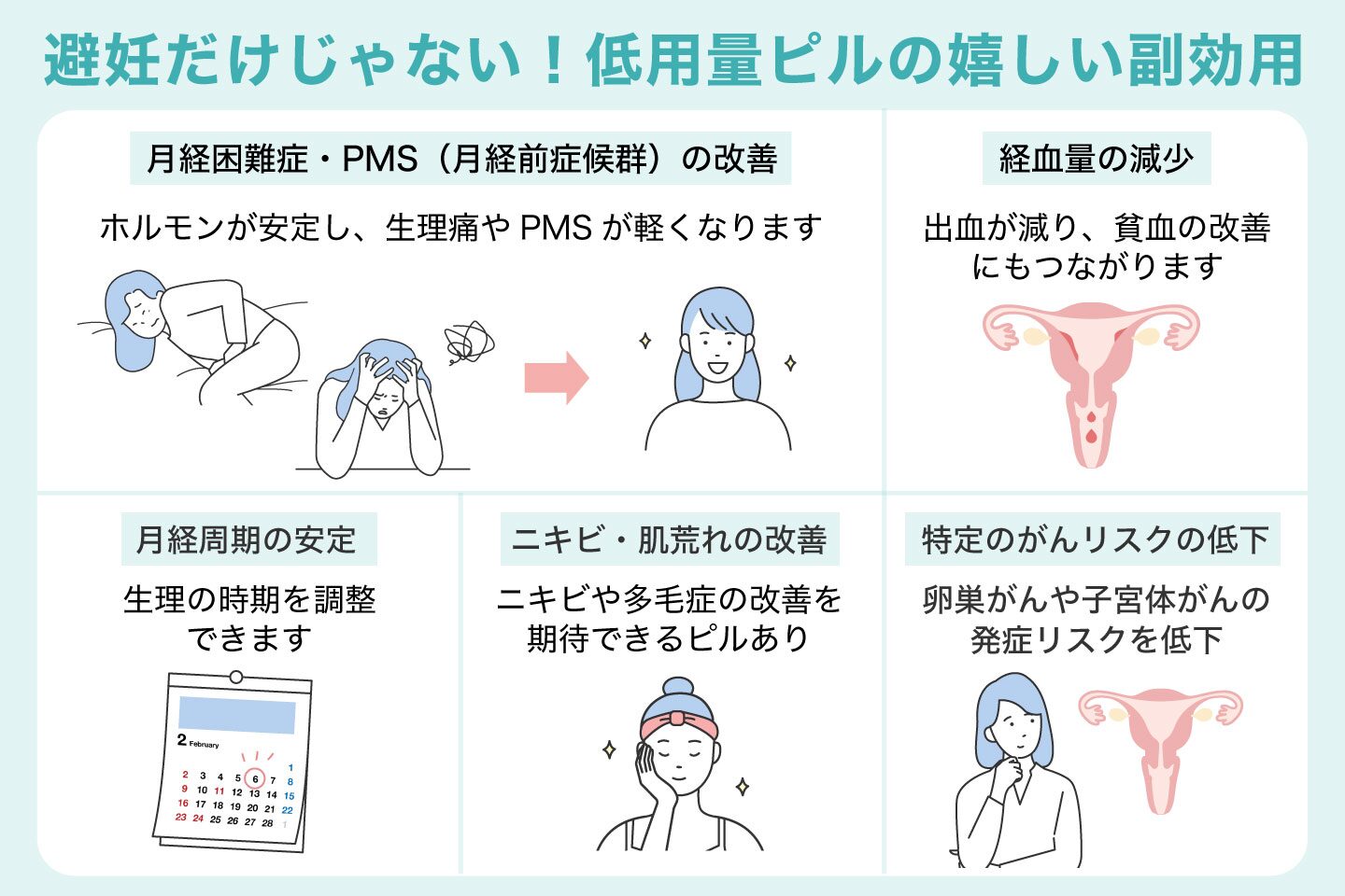 低用量ピルには、避妊以外にも女性にとって嬉しい様々な副効用(メリット)があります。