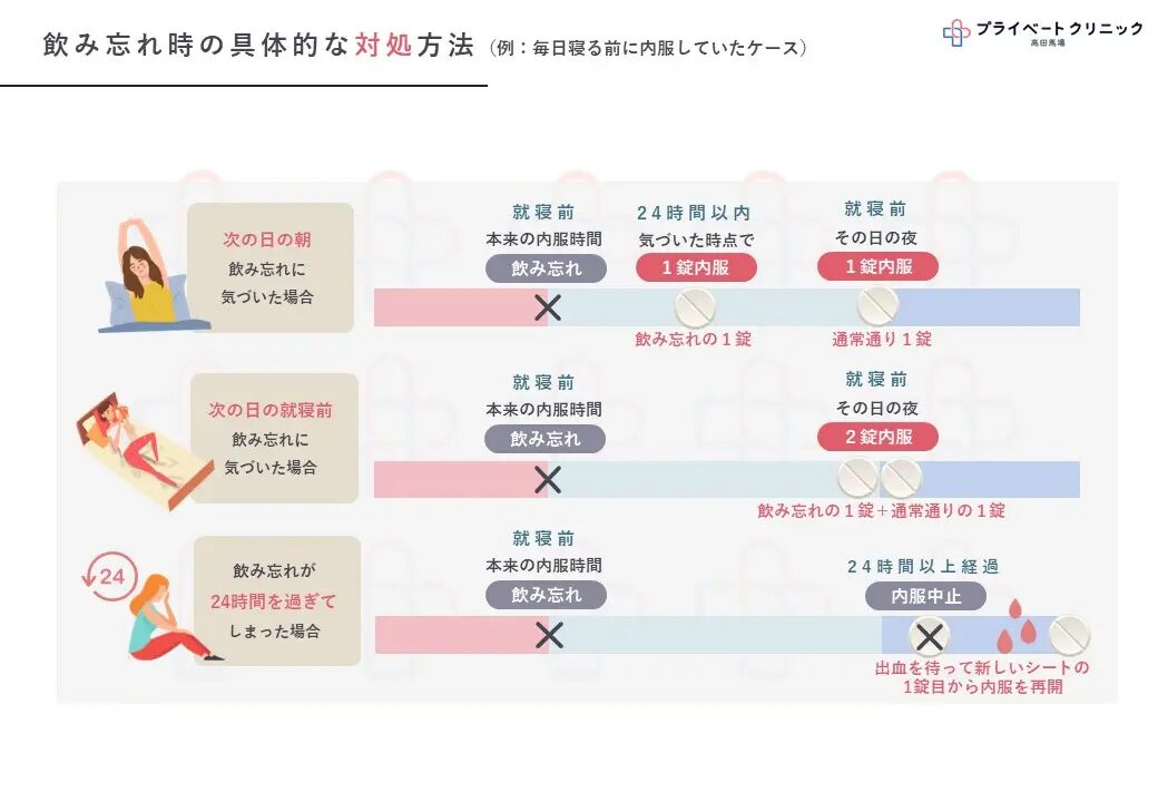うっかり飲み忘れてしまった場合の対処法です。慌てずに対応しましょう。