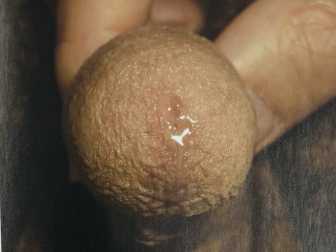 クラミジア感染に特徴的なサラサラした透明な膿が尿道から出ている